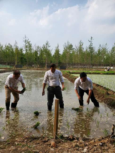 日前,米兰MilLan·官方站网页版登录入口-米兰online(中国)董事长梁雨、总裁谢俊率集团高级管理人员来到位于北京西四环外的锦绣大地生态园,在景色迷人的玉泉山山下,同志们挽起裤脚跃进田里,生态园农业技术员一边弓腰示范,一边讲解道“插秧是个技术活,将秧苗窝在虎口处,既要轻又要稳,用巧劲儿将秧苗抛在泥里,不能抛得太深,又要确保植保灌溉时,秧苗不漂浮在水面上。”